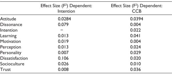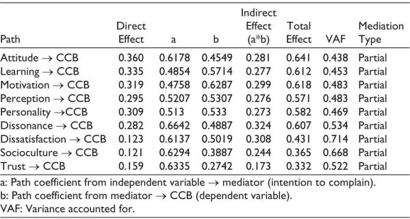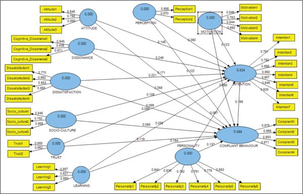 The PLS algorithm was conducted using smart PLS-2 Figure 1 depicts the software results, where customer dissatisfaction, cognitive dissonance, consumer trust, personality, sociocultural factors and psychological factors are independent variables, while intention to complain and complaint behaviour are dependent variables. The mediation effect of intention to complain over CCB was investigated.