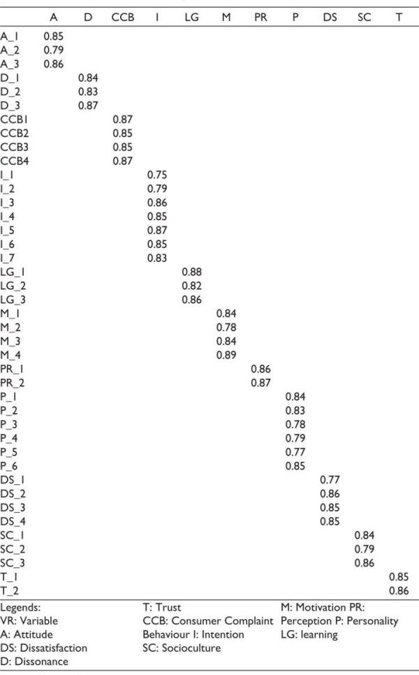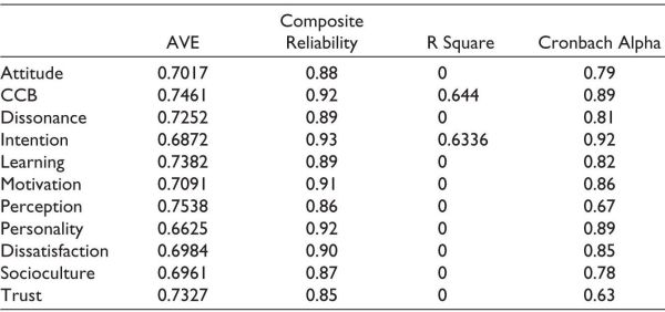 Also, 63.40% of variance in intention to complain is explained through Table 3 indicating that composite reliability is met. Convergent validity is determined by comparing AVE readings to a threshold value, such as 0.50.