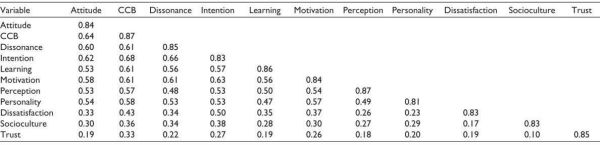 Discriminant validity was checked through Fornell-Larcker criteria. A all the diagonal values are greater than corresponding rows and column values (Pearson correlations), and hence discriminant validity is also verified.