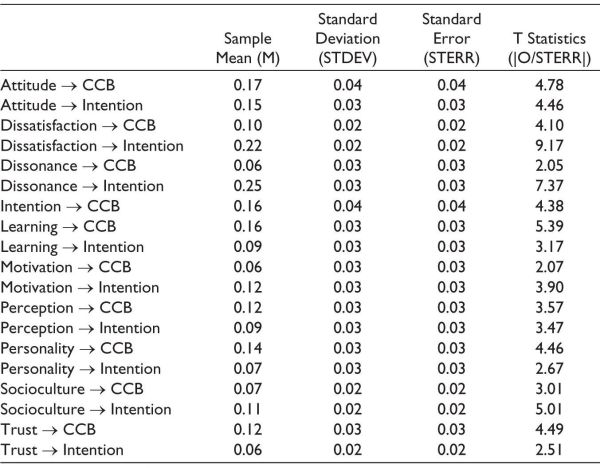 Figure 1 shows result of the PLS algorithm and it shows that 64.40% of variance in complaint behaviour is explained through customer. It was also tested whether ‘intention to complain’ mediates the relationship between other independent variables and complaint behaviour or not. The R2 value is larger, that is, 64.40 and, therefore, it can be inferred that R2 has high explanatory power.