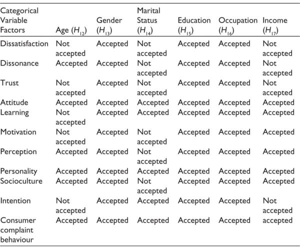 It was found that there is significant difference in the attitude towards complaining, learning towards complaining, personality, intention to complain and complaint behaviour across three categories of marital status (married, unmarried, separated). There was no significant difference between unmarried and married consumers in terms of attitude toward complaining, CCB, learning and intention to complain. Separated consumers have a negative attitude towards complaining, as well as a negative intention to complain and negative complaint behaviour.