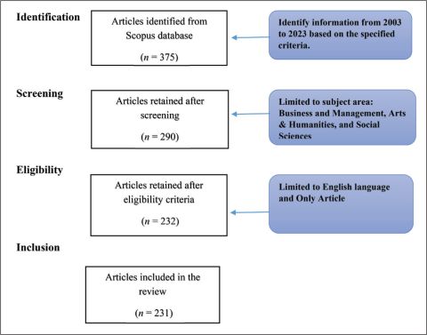 The initial stage of the research entailed a comprehensive search within the Scopus database, using specific keywords encompassing the realms of culinary tourism and destination development. The search parameters included terms such as ‘Food Tourism’, ‘Culinary Tourism’ and ‘Gastronomy’, in conjunction with phrases like ‘Tourist Destination’ and ‘Tourism Development’. This meticulous process identified 375 relevant articles published between 2003 and 2023, meeting the predetermined criteria for inclusion in the study.