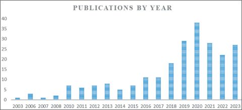 Figure 2 visually captures the dynamic evolution of culinary tourism research over time. The graph highlights a significant increase in publications in 2020, influenced by global events and heightened public interest, underscoring the impact of the field. The consistent rise in research output from 2014 to 2019 reflects continuous scholarly attention, while solitary publication in 2003 marks the modest inception and acknowledgement of culinary tourism. Exploration of factors such as global events and technology contributes to a better understanding of the research landscape. Delving into themes, regions, and collaborations offers a nuanced perspective on culinary tourism. In summary, the growth pattern and peak in 2020 (constituting 16.47% of the total) underscore the enduring significance of culinary tourism in academic inquiry, encouraging further exploration and ongoing scholarly engagement.