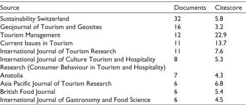 Table 1 outlines the prominent journals in culinary tourism research, considering both document count and Citescore. ‘Sustainability Switzerland’ leads with 32 publications and a Citescore of 5.8. Notably, ‘Tourism Management’ stands out with a substantial Citescore of 22.9, despite a lower document count of 12. Journals like ‘Current Issues In Tourism’ and the ‘International Journal of Tourism Research’ share 11 documents but differ significantly in Citescores, indicating varying impact. The diverse range of Citescores for journals like ‘International Journal of Culture Tourism and Hospitality Research’, ‘Anatolia’, ‘Asia Pacific Journal of Tourism Research’, ‘British Food Journal’ and ‘International Journal of Gastronomy and Food Science’ underscores the nuanced landscape of culinary tourism scholarship. This information aids researchers in identifying influential outlets for their work based on both document count and impact metrics.