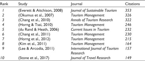 Table 2 outlines the ten most cited studies in culinary tourism research, shedding light on impactful contributions. Topping the list is Everett and Aitchison’s (2008) study in the ‘Journal of Sustainable Tourism’ boasts 353 citations. Okumus et al. (2007) work in ‘Tourism Management’ and secure the second spot with 326 citations. Studies by Chang et al. (2010, 2011), published in the ‘Annals of Tourism Research’ and ‘Tourism Management’, respectively, claim third and sixth positions with 322 and 230 citations, respectively. Horng and Tsai’s (2010) contribution to ‘Tourism Management’ secures the fourth spot with 246 citations, while du Rand and Heath’s (2006) work in ‘Current Issues in Tourism’ occupies the fifth position with 232 citations. This ranking underscores the enduring influence of specific studies, providing researchers with insights into foundational works that have significantly shaped culinary tourism research.