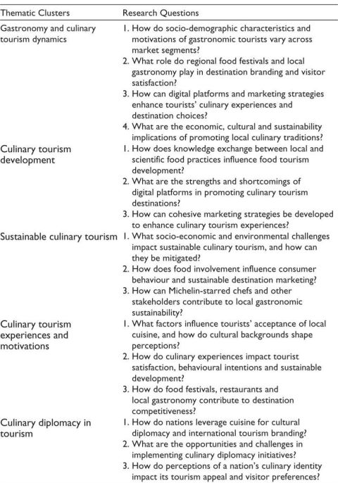 Research on culinary tourism spans diverse themes, including destination branding, tourist motivations, sustainability, technological innovation, cultural preservation and policy frameworks. Scholars highlight how destination promotion, authentic experiences and technological advancements shape culinary tourism while emphasising economic growth, cultural preservation and visitor satisfaction.