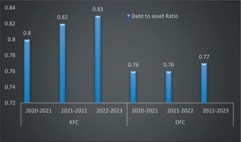 The solvency indicators in Figure A3, Figure A4, Figure A5 shed light on the long-term financial risk associated with each institution. Figure A3 shows that DFC’s debt-to-equity ratio has worsened dramatically, rising from 6.29 in 2020–2021 to 8.62 in 2022–2023, indicating high financial leverage and excessive dependence on borrowed funds. KFC, although leveraged, maintains a much healthier debt-to-equity level of 3.35 in 2023. The debt-to-asset ratio in Figure A4 indicates that both corporations finance a substantial portion of their assets through debt (0.76 for DFC and 0.83 for KFC); however, KFC’s stronger profitability allows it to manage this debt more effectively. The interest coverage ratio in Figure A5 shows that DFC’s ability to pay interest has improved slightly to 2.01, but this improvement is overshadowed by its overall poor profitability. KFC’s interest coverage ratio has declined to 0.79, indicating a rising interest burden; however, given its positive earnings, KFC remains less vulnerable than DFC. Collectively, the solvency figures indicate that DFC is in a high-risk zone with long-term financial instability, while KFC maintains manageable leverage supported by operational profits.