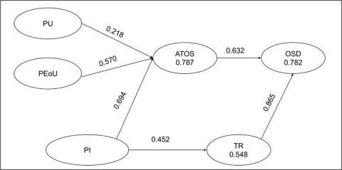 Note: PeoU: Perceived ease of use; PU: Perceived usefulness; ATSO: Attitude to shop online; PI: Personal innovativeness; TR: Trust; OSD: Online shopping decision.