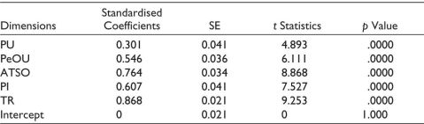 Thus, the study confirms that all hypothesised linkages in the model are statistically significant. PEoU significantly influences attitude towards online buying. Additionally, PU impacts attitude, which in turn affects behavioural intention.