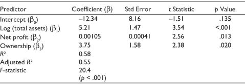 To determine whether differences in environmental disclosure persist beyond structural and financial capacity, a multiple regression was estimated across 30 major Indian banks (Table 3). The model, with R2 of 0.58 ((adjusted R2 = 0.55, F = 20.4, p < .001), reveals that logarithm of total assets is a strong and significant predictor (β = 5.21, p < .001), indicating that larger banks disclose more on environmental practices. Net profit also has a positive and significant effect (β = 0.00105, p = .013), indicating that more profitable banks engage in deeper environmental reporting. Ownership remains a significant factor (β = 3.75, p = .020), confirming that private banks score on average 3.75 points higher than public sector banks, even after accounting for size and profit.